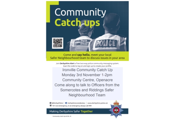 November's Community Catch-up for the Ironville area will take place outside the Community Centre, Openacre on Monday 3rd November between 1300-1400.
