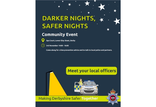 | As the Nights are getting longer, learn how to stay safe and speak to your local safer neighbourhood officers. Join us on Monday 3rd November from 2pm- 4pm on Spa Court, Lower Eley Steet, Derby DE1 1PY for our Darker Nights, Safer Nights Event. #CommunityPolicing #Priorities #CrimePrevention