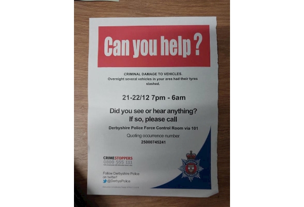 Just prior to Christmas, the Safer Neighbourhood Team appealed for information and conducted enquires in Darley Dale following a series of tyres being damaged on vehicles which were parked on the following roads: If you have any information regarding the matter or have CCTV imagery still available of anyone who was acting suspiciously overnight of the 21st to 22nd December, you can still send it to us directly using the following link: https://derbyshire.uk.evidence.com/axon/community-request/public/criminaldamage