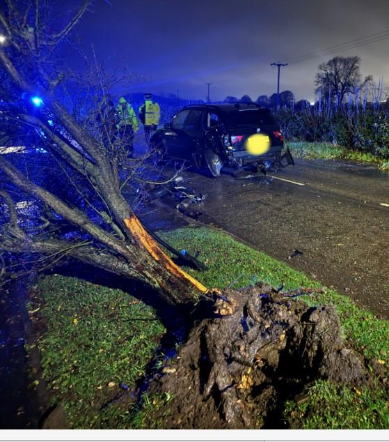 Despite poor weather conditions, the driver has driven dangerously and at speed through Linton before travelling onto the wrong side of the road, loosing control, striking a tree and then ploughing into another which such force, causing the tree to be knocked down with the BMW loosing wheels and various parts of the car before finally coming to rest in the middle of Cauldwell Road.