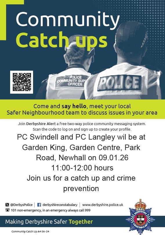 Come and meet your local officers! Our new Swadlincote police officer PC Langley will be attending a community Catch Up event on Friday 9 January 2026 at 11:00-12:00 hours with PC Swindell from Swadlincote Police SNT at Garden King Newhall. This is a great opportunity to say hello, ask questions, share any local concerns, or just have a chat about what matters to you in the community. We look forward to seeing you there! 💬🚓