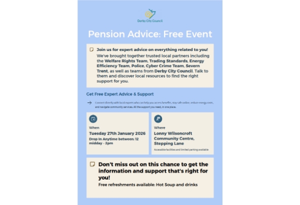 Join Derby City Council on Tuesday the 27th of January between 12:00 and 14:00 at the Lonny Wilsoncroft for a FREE event to discuss pension advice and to get any support.