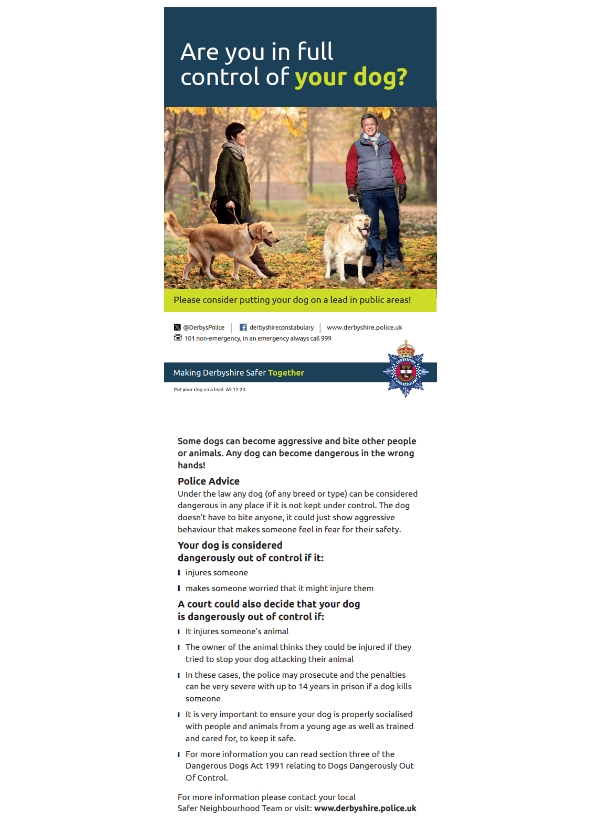 If you have any issues or concerns with a dog in the community, please call 101 or report it via the Derbyshire Constabulary Website.