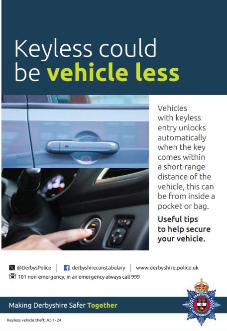 Useful tips Keyless car theft or 'relay theft' is when a device is used to fool the car into thinking the key is close by. This unlocks the car and allows the ignition to start. Thieves only need to be within a few metres of your car key to capture the signal, even if it's inside your home. This means that even if your car and home are secure, thieves can still unlock, start and steal your car. Keep car keys safe - When at home keep your car keys {and the spare) away from the car to disrupt communication range, avoid leaving them near your door or window. Use a signal-blocking pouch - Put the keys in a screened or signal-blocking pouch, such as a Faraday Bag, always check the bag or pouch is still working every few months. Turn off the fob's wireless signal - Wireless signals on some keyless Fobs can be turned off. Look in your car manual to see if this is possible, if not, contact your vehicle manufacturer. Reprogramme your keys - When you buy a second-hand car, this will erase the code from the car key to the car itself. Meaning a spare car key that is not in your possession can no longer be paired, leaving it susceptible to theft. Contact your local Master Locksmith Association (MLA) approved auto locksmith - https://orlo.uk/Nfr0L Additional physical security - Steering wheel lock, pedal boxes and gear stick locks, tested to Sold Secure can be an effective tool in the fight against keyless thefts, purely for the reason that it cannot be compromised via technology. It's also worth speaking to your vehicle dealership about installing an aftermarket immobiliser approved by the manufacturer. Watch for illegal tow trucks - Thieves often attempt to lift vehicles from the street. If you see a towaway crew acting suspiciously, especially if their vehicle isn't branded or if they're not in uniform please report it immediately. Parking - If you have a garage, use it to secure your vehicle in. Parking on the driveway, park as close to the property as you can. As with any additional security for vehicles, try to purchase devices that are: Thatcham quality assured: https://orlo.uk/nktiT Sold Secure tested: https://orlo.uk/fWL7Z Secured by Design approved: https://orlo.uk/zKM9M Thatcham's consumer security rating keeps drivers informed of the theft risk of new cars and assesses a new vehicle's all-round security. This can be a handy tool to check before purchasing a vehicle. You can access the information: https://orlo.uk/dEXEF  Please click here to complete the survey