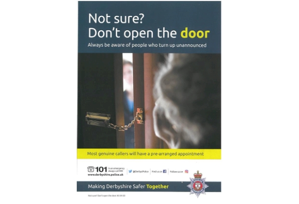 The following advice is being circulated following a recent report of people going to door to door in the Youlgrave this evening. Preventing Doorstep Crime Doorstep crime can include rogue traders, offering home improvement or gardening services, or bogus callers who claim to be the council, police, health carers or energy companies. If in doubt – Keep them out. Rogue Traders may: • Say they are in the area and have spotted a problem with your home or garden. • Claim to have materials left from another job, like paving or tarmac. • Try to pressurise you to buy goods or sign up for services on the spot. • Offer to carry out work cheaply but charge an extortionate price after it have been completed. • Offer to drive you to a bank so you withdraw money to pay them. • Provide false names, addresses, or telephone numbers. A pedlar is someone who calls at your door to sell items that they have on offer. This can often include cleaning or household goods. • By law, they are required to carry a pedlar’s certificate, which are issued by police force in the area where they live. Bogus Callers may: • Claim to be working for the council, water, gas, or electric company. They could also say they are a nurse, doctor, or from the police. • Say they need to come into your home or try to get you to go outside. • Try to distract you so they can steal your money. • Can be male, female or even children. Tips to keep you safe • Check the identity of any caller. Confirm who they are by calling the company they work for using number from the telephone directory or a bill. • Ask a neighbour to come around to check them before you open the door. • Tell them to come back at a time when someone will be at home with you. • Keeps doors and windows locked and use the door chain every time you answer the door. Please report suspicious behaviour on the following contact methods: 🔵 999 in an emergency 🚓 101 in a non emergency 🚔 Visit https://www.derbyshire.police.uk/ and use the report tab 🚨 Message the main Derbyshire Police Facebook Page #CommunityPolicing #SaferStreetsDerbyshire #CheckIDatthedoor