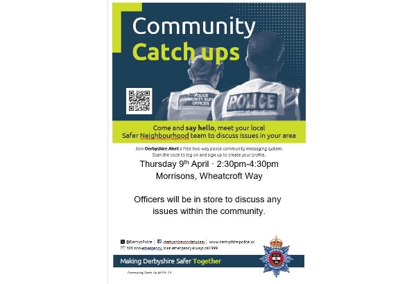 Local officers from the Safer Neighbourhood Team will be hosting another Community Catch Up event this week. We are set to host this pop up event in Chaddesden tomorrow to give members of the public a chance to speak about any local policing issues or concerns. It will take place at Morrisons, Meteor Centre on Thursday 9th April between 2:30pm and 4:30pm. Come along and pick up advice on crime prevention and find out more information about keeping in touch with us through our free Derbyshire Alert messaging system. If you are unable to make it, but would still like to contact us, please do so on the following non-emergency methods. · Website – We have crime reporting tools on our website: www.derbyshire.police.uk · Facebook – send us a private message to the Derbyshire Constabulary Facebook page · Phone – call us on 101 You can also anonymously contact the independent charity CrimeStoppers, on 0800 555 111, or by visiting the CrimeStoppers website: www.crimestoppers-uk.org