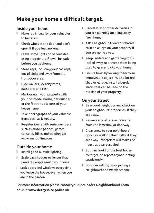 I wanted to provide you with an update regarding Burglary - House, which people around your area have highlighted as an issue of concern on the priority survey. 🚓 Raising Awareness … Reducing Crime 🚓 Burglary is a particularly invasive crime that can have a lasting impact on victims. If you have been a victim and need support and help, you should have been offered the services of Victim Support. You may have declined at the time, or not noticed the offer, but can refer yourself at any time by either calling 0808 168 9111 or visiting their website www.victimsupport.org.uk. Burglars do not want to get caught, so taking action to make your home or business premises safe and less attractive to thieves can go a long way to reducing the risk. Not all advice, or security products recommended are the same, or necessarily fit for purpose. If looking to take positive action to prevent yourself from being a victim of this type of crime, help and advice can be found on the Neighbourhood Watch website. If you ever experience this issue or have information regarding an incident, please report it using our online reporting tools at https://www.derbyshire.police.uk/, speak to an operator in our Force Communications Room via our online web chat or call the non-emergency number 101. Alternatively, you can stay 100 per cent anonymous by contacting the independent charity Crimestoppers on 0800 555 111 or via their untraceable online form at crimestoppers-uk.org. Get Involved Please consider getting involved by registering for these messages, this will enable you to contribute to the local priority survey. We may be unaware of issues that you would like us to focus on. Take a few minutes to securely and privately register and have your say using the button below, this will mean we can focus on things that matter to you. | ||